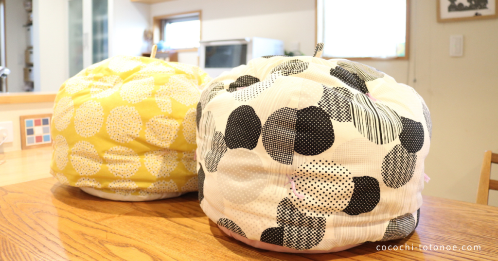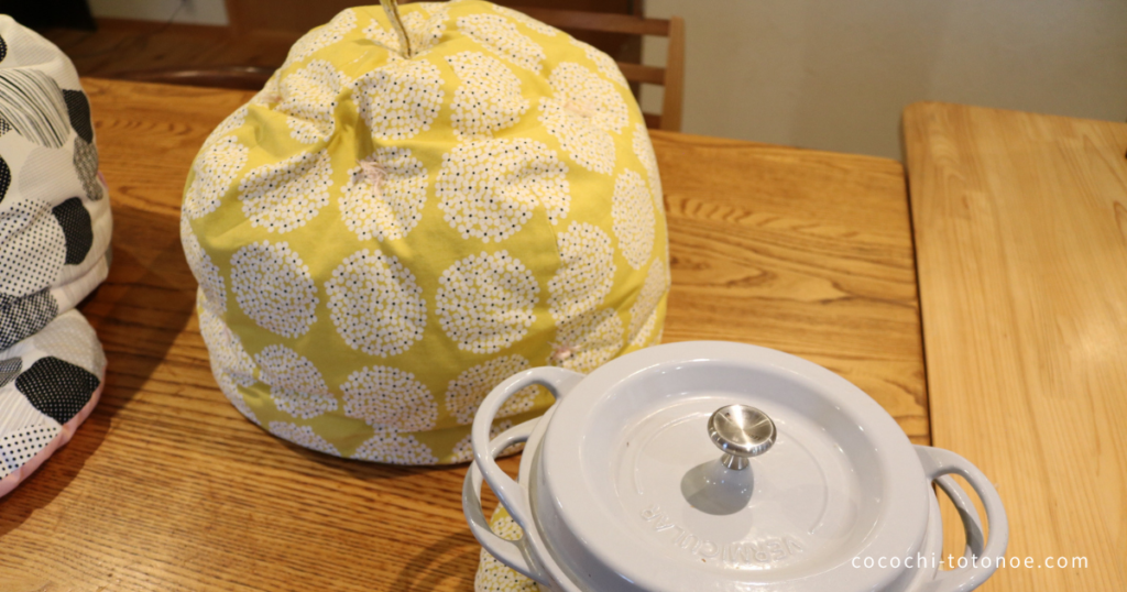 鍋帽子は、一言でいうとたっぷりの綿を包んだ布でできた保温調理グッズです。