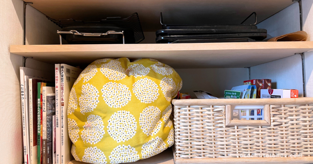 棚の上など高い場所にポンと置いたり、小さめに畳んでパントリーの空いているスペースに入れたりできます。我が家では、使わないときはパントリーの上の方に置いています。